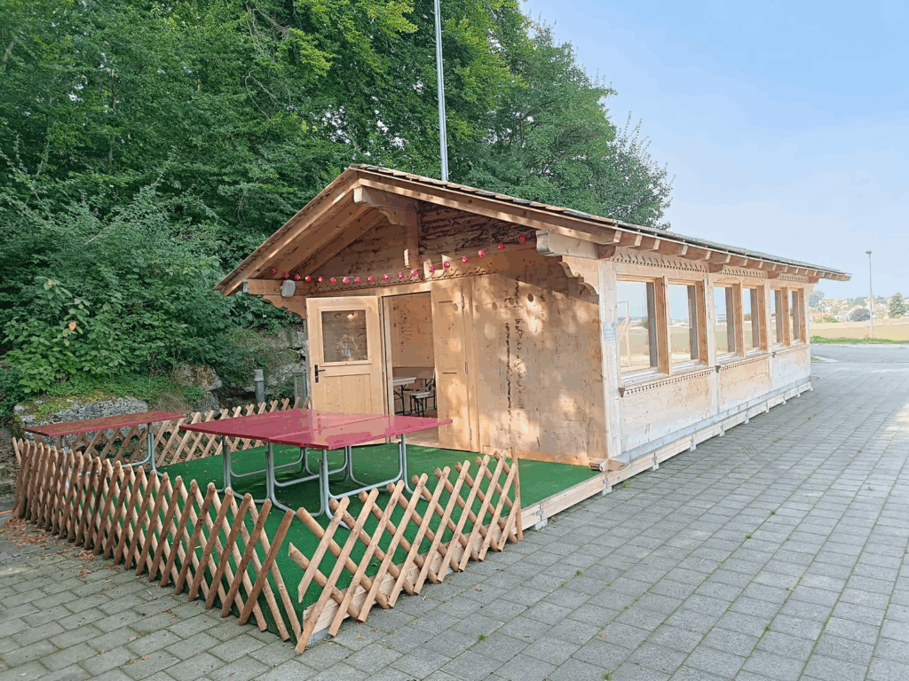 Wir haben direkt neben der Schlittschuhbahn ein wunderbares Chalet platziert, welches vom Schwarzsee zu uns transferiert wurde. Es bietet Platz für max. 40 Personen, hat einen integrierten Pelletofen und eine Bar. Zudem ist eine professionelle Musikanlage installiert. Getränke und Snacks sind immer erhältlich.